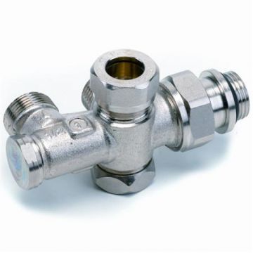 Een voetventiel wordt tussen twee componenten van de radiator geplaatst. Hierdoor wordt de stroming van het water in de radiator geregeld.